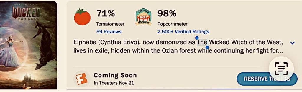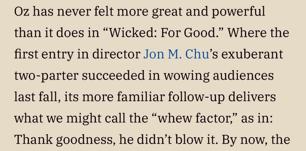 Variety’s Peter Debruge rarely lays it in the line —his deft phrasings often seem to skirt or hint at his actual, true-blue reactions —.but his real feelings about Jon M. Chu’s Wicked: For Good are evident in the first paragraph of his 11.18 review, as well as in the final one.