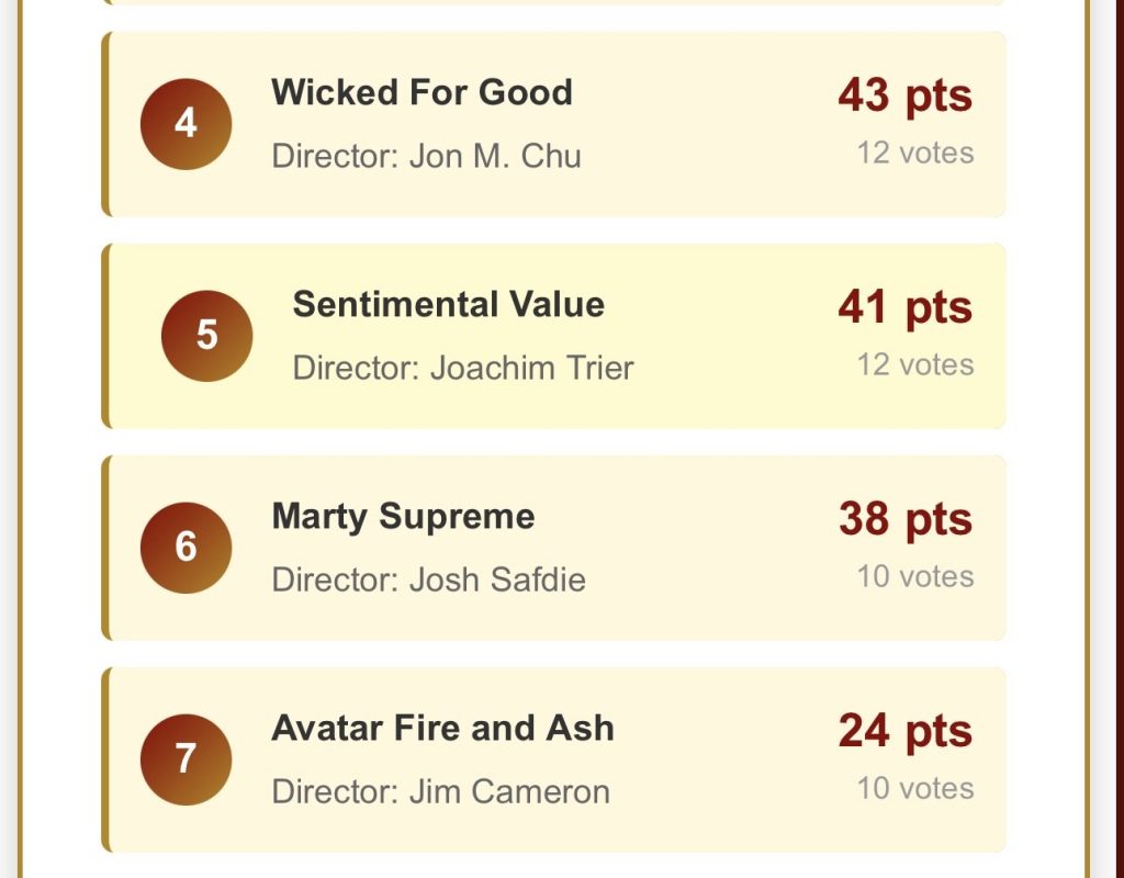 Imagine calculating that the Samuel Z. Arkoff-level Sinners and the agreeable but low-Metacritic–rated and nothing-to-really-write-home-about Wicked: For Good are more likely to win the Best Picture trophy than Trier’s obviously superior and sublimely performed family drama…