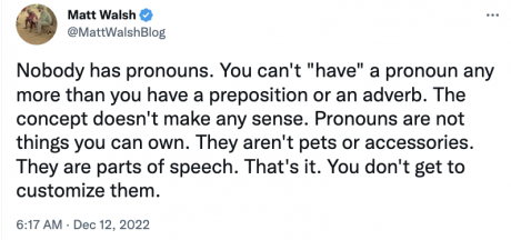 HE understands and accepts that curious pronoun usage is a “thing” among a miniscule percentage of the population, and it’s not worth sweating over. HE’s pronouns are he/him/his…take it or leave it.