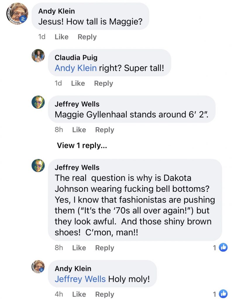 HE to Gyllenhaal, Johnson: Please don’t — they look awful. Not to mention Johnson’s ghastly super-wide jacket lapels.