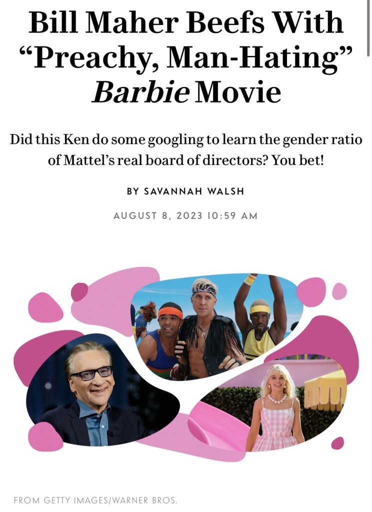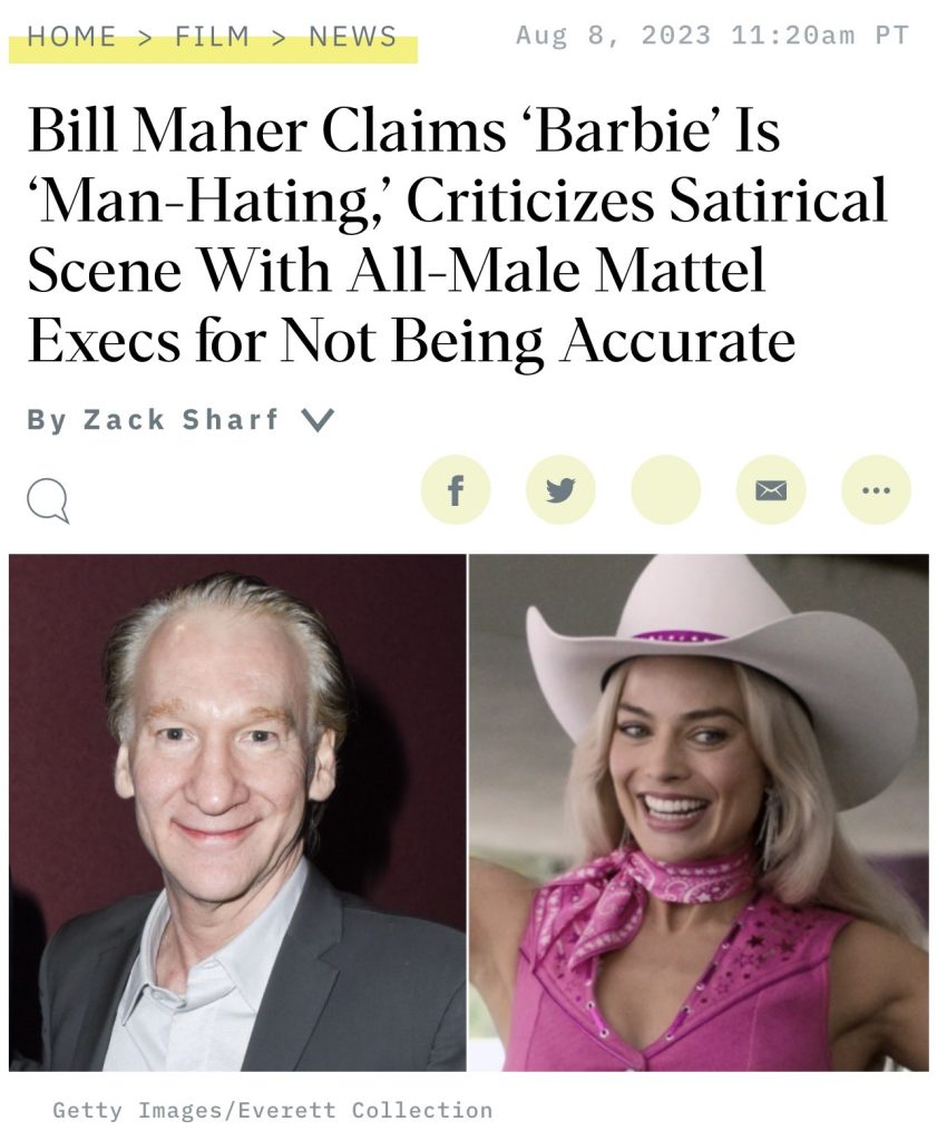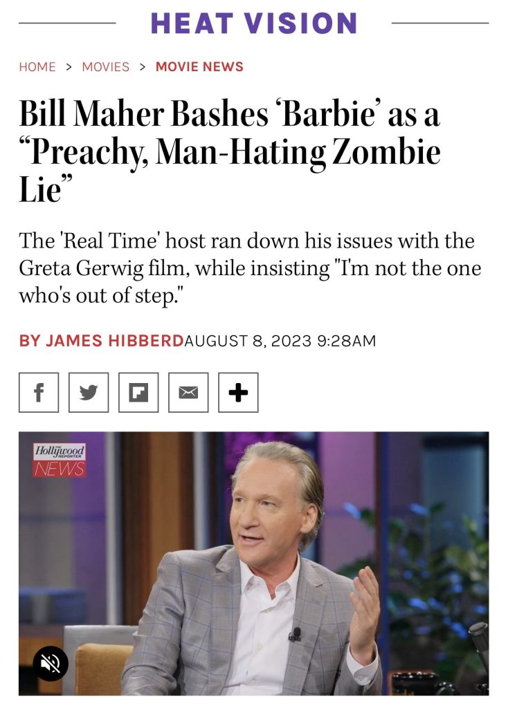 Earlier today Variety’s Zack Sharf, The Hollywood Reporter’s James Hibberd and Vanity Fair’s Savannah Walsh bitch-slapped Real Time’s Bill Maher for tweeting that Barbie is a “man-hating zombie lie.”