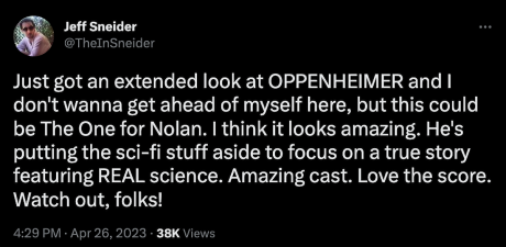 When was the last time Chris Nolan had no choice but to explore or otherwise settle into a reality realm — a realm defined by the same terms that all sane earthlings are more or less obliged to live by? The answer, of course, is 2017’s Dunkirk. But before that, Nolan’s last RR flick (i.e., no exceptional visual augmentation) was Insomnia, which is nearly 20 years old. (It opened at the Tribeca Film Festival on 5.3.22, and commercially on 5.24.02.)
