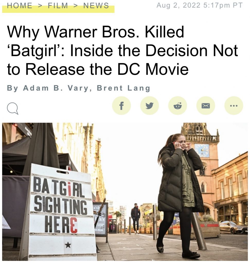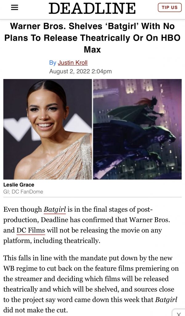Batgirl Erasure Update: Variety’s Adam B. Vary and Brent Lang are reporting that Warner Bros. scrapped The Batgirl not just because they didn’t like it, but because it made sense from a tax write-down perspective. Apparently the tax returns will allow them to make their budget back if they don’t release it.