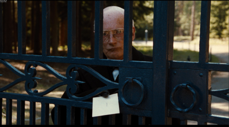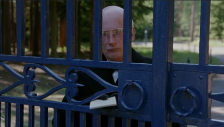 [Insert: Top frame grab is how the envelope scene has always looked since 1999…the iron gates are vivid blue, freshly painted. Bottom frame grab is from the Criterion 4K Bluray…somber greenish teal.]