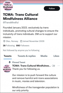Initial Monday (1.23) posting: Keep in mind that the Trans Cultural Mindful Alliance (TCMA), formed and staffed by a Norweigan group of trans activists, only came into being this month (probably only a week or two ago) and for all we know consists of a relatively small number of members. Or not…who knows? Maybe there are thousands of members. But I doubt it.