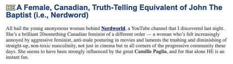From HE’s own Nerdword (youngish, Canadian, female) comes another lament about aggressive, dude-dissing fembot narcissism having led to a mass emotional abyss in which everyone seems to have forgotten what happiness or at least emotional contentment looks like.