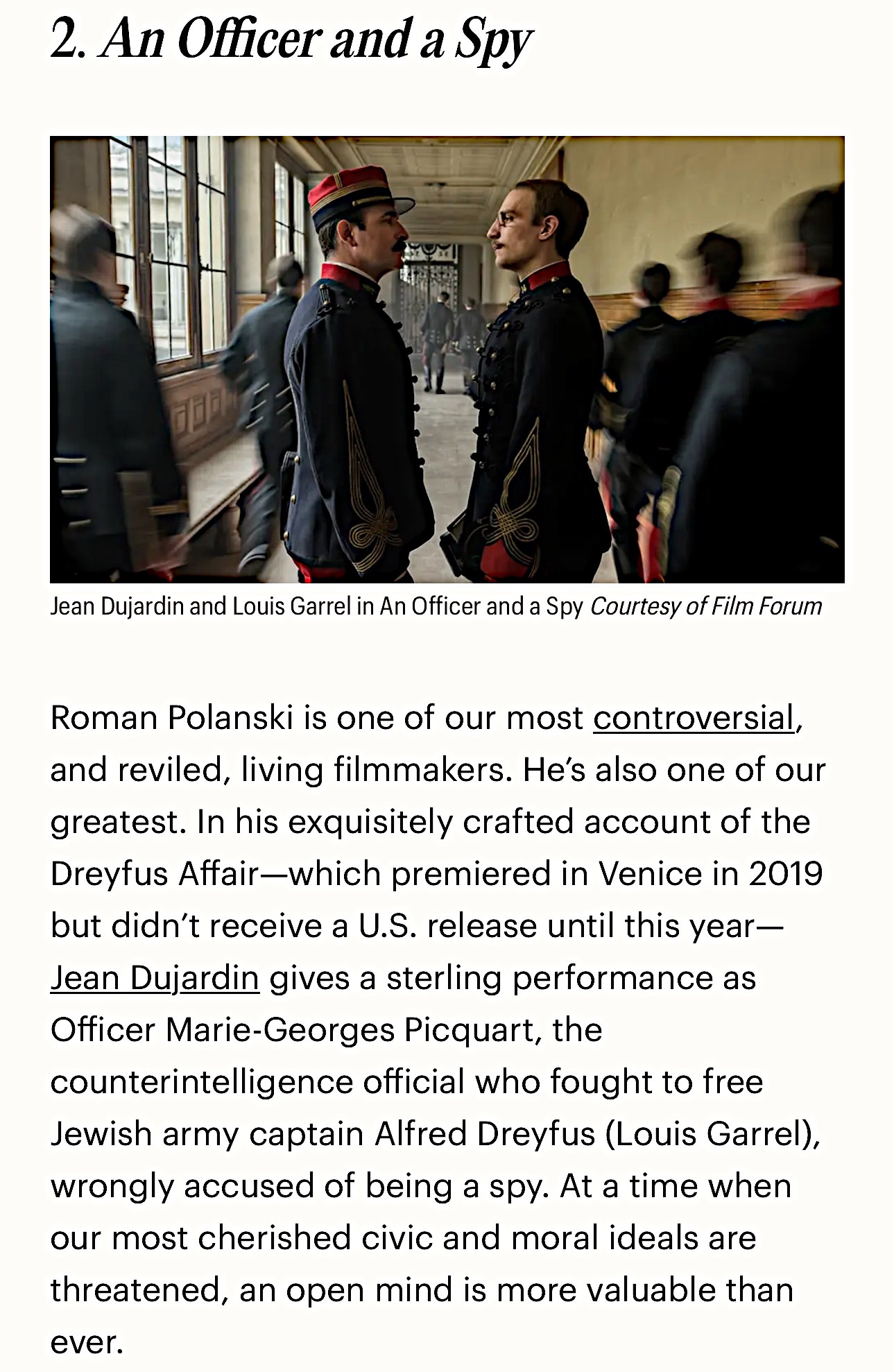 1. Roman Polanski‘s J’Accuse, 2. David Fincher‘s Zodiac, 3a. Steven Soderbergh‘s Traffic; 3b. Paul Greengrass‘s United 93, 4. Alfonso Cuaron‘s Children of Men, 5. Spike Jonze‘s Adaptation; 6. Polanski’s The Pianist, 7. Florian Henckel von Donnersmarck‘s The Lives of Others, 8. Tony Gilroy‘s Michael Clayton, 9. Cristian Mungiu‘s 4 Months, 3 Weeks and 2 Days, 10. Todd FieldsIn the Bedroom, 11. Joel and Ethan Coen‘s No Country For Old Men, 12. Kathryn Bigelow‘s The Hurt Locker, 13. David Fincher‘s The Social Network, 15. Asghar Farhadi‘s A Separation, 16. Bennett Miller‘s Moneyball, 17. Bigelow’s Zero Dark Thirty, 18. David O. Russell‘s Silver Linings Playbook, 19. Martin Scorsese‘s The Wolf of Wall Street, 20. Steve McQueen‘s 12 Years A Slave, 21. Kenneth Lonergan‘s Manchester By The Sea, 22. Luca Guadagnino‘s Call Me By Your Name, 23.Ruben Ostlund‘s The Square, 24. Paul Schrader‘s First Reformed; and 25. Kent JonesDiane.