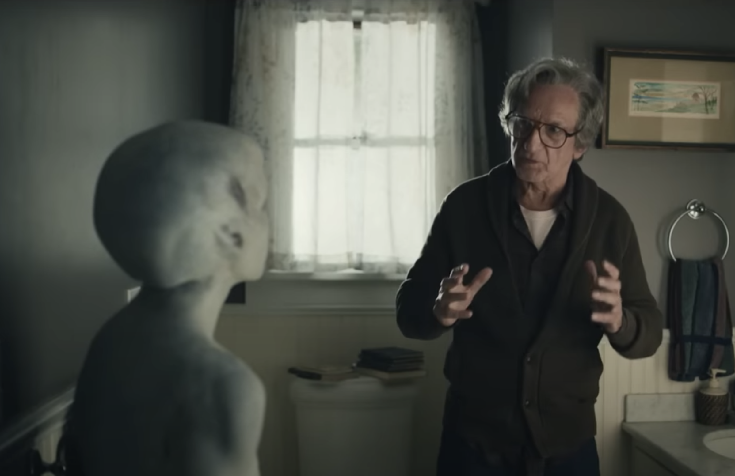 After Milt’s friend Sandy (Harriet Sansom Harris) drops by and begins to warmly relate, the alien is given the “Jules” moniker (as in Jules Pfeiffer or a nickname for Julia). Milt and Sandy quickly become Jules’ parents, and then in short order they’re being assisted by Joyce (Jane Curtin), a vaguely neurotic acquaintance who starts talking to Jules as if she’s her therapist, sharing stories of her colorful youth in Pittsburgh (“I used to be an item”) and, in an odd detour, performing Lynyrd Skynyrd‘s “Free Bird” a capella.