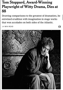 The sublimely gifted Tom Stoppard, the Czech-born, British-seasoned author of Rosencrantz and Guildenstern Are Dead (’66), Jumpers (’72), Travesties (’74), Night and Day (’78), The Real Thing (’82), Hapgood (’88), Arcadia (’93), The Invention of Love (’97), The Coast of Utopia (saw it at the Vivian Beaumont in ’07), Rock ‘n’ Roll (’06) and Leopoldstadt (’20)….one of the greatest fellows I’ve ever “known”, so to speak, has passed at age 88.