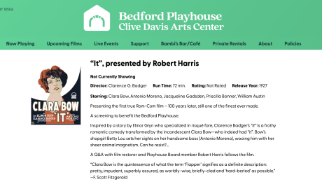Blue-chip restoration guru Robert Harris is currently putting the finishing touches on an It restoration, and this spiffed-up, 99-year-old classic (“the first Hollywood romcom”) will screen sometime in late May or early June at the Bedford Playhouse.