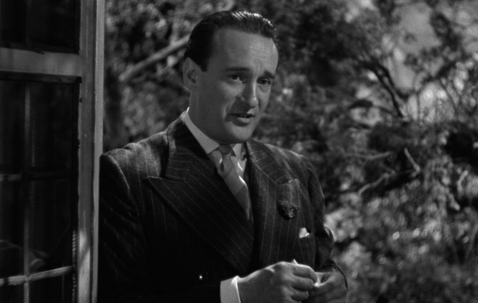 Look at George Sanders‘ Jack Favell in these DVD Beaver-captured images. The lighter version is from the 2012 MGM Bluray (which I am totally happy with — thank God there’s a fine-looking Rebecca that hasn’t been inked up) and the darker, of course, is from the Criterion. What kind of sick-fuck cineaste would prefer the darker image? It looks as if heavy thunderstorm clouds are passing over Manderley, and that Favell is about to get soaked.