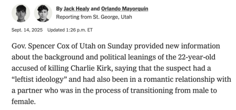1:55 p.m.: This morning the N.Y. Times finally threw in the towel by reporting that Tyler Robinson has “been in a romantic relationship with a partner who was in the process of transitioning from male to female.”