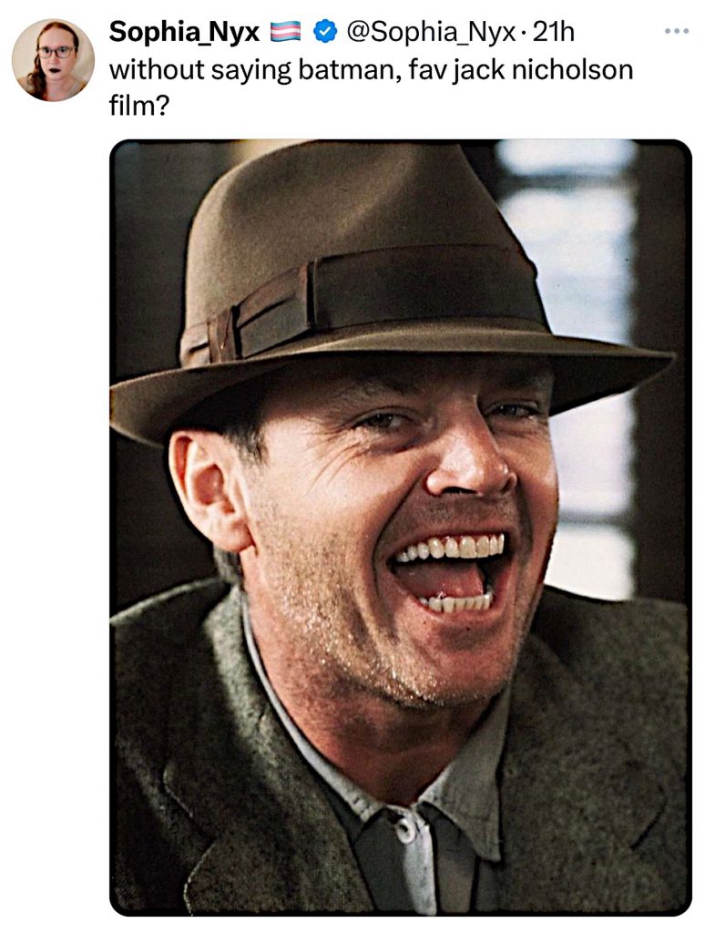 HE’s favorite Jack Nicholson films are, in this order, The Last Detail, Prizzi’s Honor, Chinatown, Carnal Knowledge, Heartburn, The Departed, Five Easy Pieces, Easy Rider, As Good As It Gets, The Shining, Terms of Endearment, The Passenger.