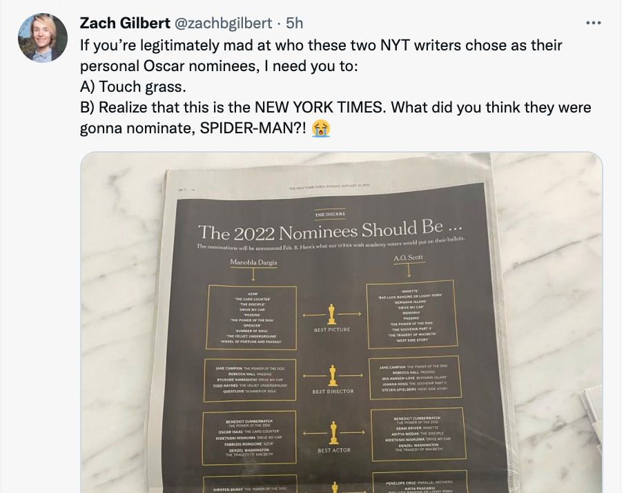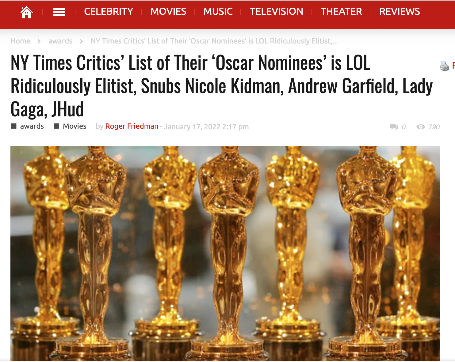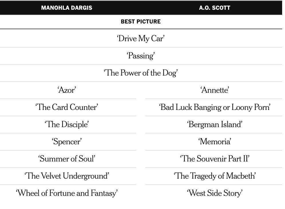 Due respect but after pondering A.O. Scott‘s recently posted list of the most award-deserving films of ’21, I have to acknowledge the possibility that even within his bizarre arena of N.Y. Times woke-itude, Scott may be even more of an eccentric than White, and that’s saying something.