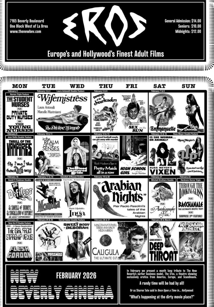 A New Beverly tribute to the Eros, a stroke-house that operated out of the same auditorium between ‘70 and ‘77, will launch on Monday, February 2nd. And to tumescence itself. Mostly hard-R grindhouse fare, mostly released in the ’70s. The Eros became the Beverly Cinema in ‘78 or so. Quentin Tarantino took ownership in 2007, rechristening it as the NewBev.