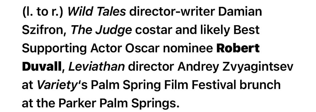 The third time was during the January 2015 Palm Springs Film Festival, at a Variety Creative Impact Awards brunch at the Parker Palm Springs. Duvall was there to promote David Dobkin’s The Judge , which had opened the previous October. I was shooting the shit with Duvall, Variety’s Stephen Gaydos, Leviathan director Andrej Zvyaginstsev, two or three others. At one point I asked if I could snap a group shot. “Yeah, let’s do it,” said Duvall.