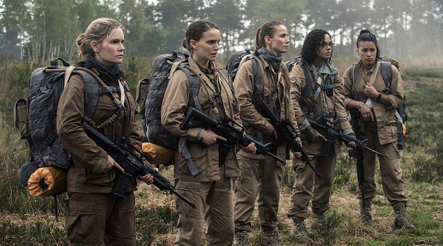 Five well-armed soldier women — a biologist played by Natalie Portman plus Jennifer Jason Leigh, Tessa Thompson, Gina Rodriguez and Tuva Novotny — enter this realm on foot, hoping to figure out the root of it all and at the same time save the life of Portman’s husband (Oscar Isaac) who has escaped Area X but is all fucked up…lethargic, no memory, spitting blood, ridden with disease.