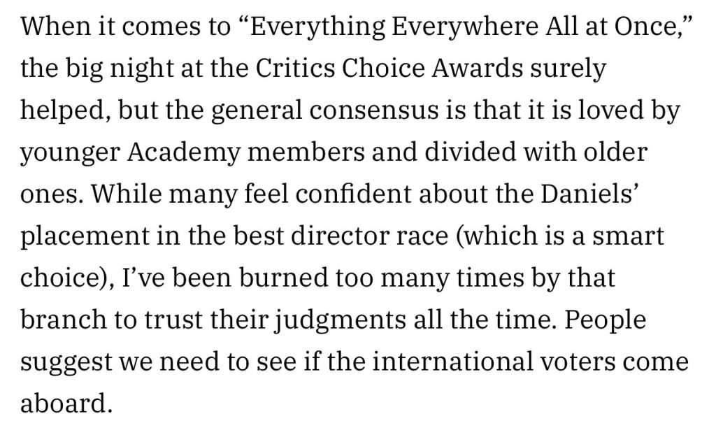 In a two-day-old (1.17) Oscar assessment piece, Variety’s Clayton Davis dutifully reported what almost everyone except for guys like Bobby Peru have accepted since the ‘22 / ‘23 Oscar season began several months ago, which is that Everything Everywhere All At Once is probably too divisive (read: hated by the over-45 crowd) to prevail in the Best Picture category unless international voters come to its rescue (“rally round the flag, boys!”).