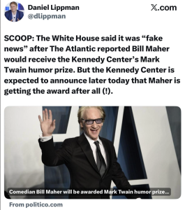 Atlantic editor Jeffrey Goldberg: “The Atlantic reported first and accurately that Bill Maher was going to receive the Mark Twain Prize. The White House’s obfuscation strategy here is not effective.”