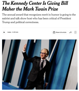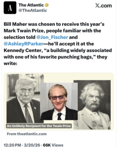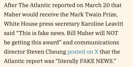 How could Donald Trump have been so submental or…I don’t know, thoughtlessly gut-tethered as to call The Atlantic‘s recent, 100% accurate report that Bill Maher will receive the annual Mark Twain Award “fake news“?