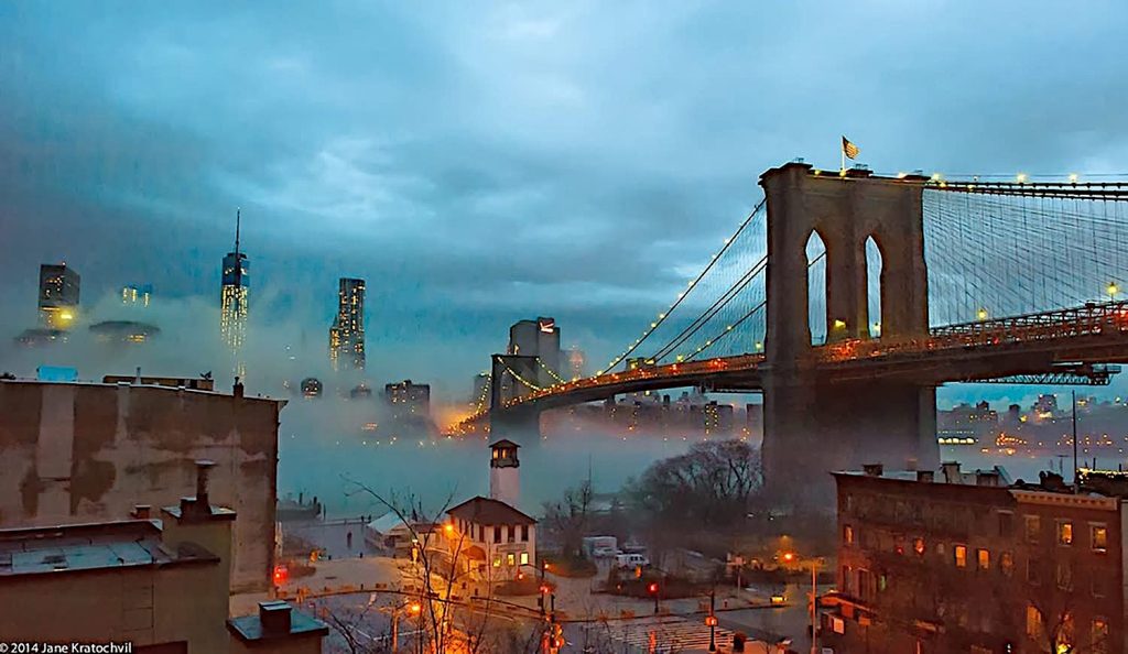 Yesterday I was knocked out by a nocturnal photo of the Brooklyn Bridge, which had been posted on Facebook by Reid Rosefelt. It has a fantasy-world quality…pinpoints of golden amber enshrouded by fog clouds, like an image of nighttime London out of Disney’s Péter Pan (‘53).