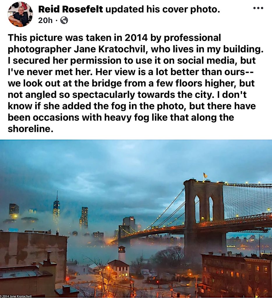 Reid later clarified that the photo has been snapped by event photographer Jane Kratochvil, who lives in Reid’s building but has a better view of the bridge.