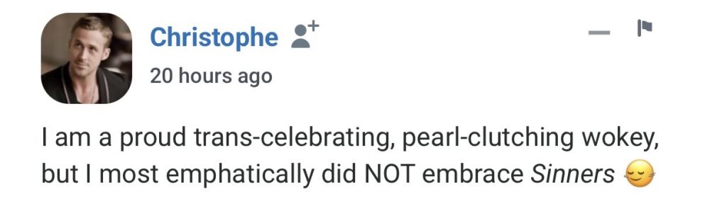 It’s almost okay to be a wokey if you didn’t like Sinners…respectful salute to Christophe.