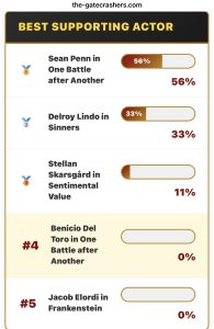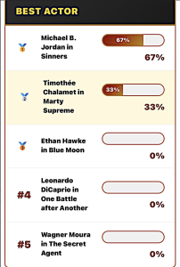 Michael B. Jordan beating Timothee Chalamet or Ethan Hawke? Handing the trophy to Delroy Lindo rather than Stellan Skarsgard? Because of Davidson’s affliction? This is ludicrous lemming-think — self-delusion en masse.