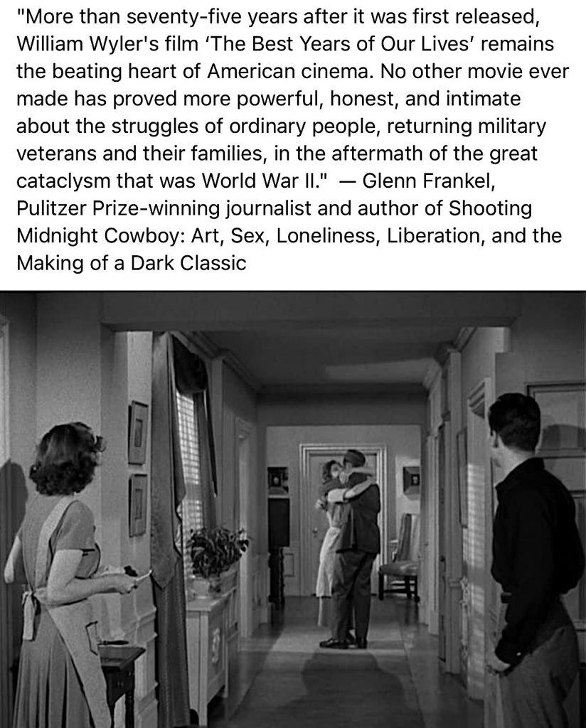 …I post a little tip-of-the-hat mention of William Wyler’s The Best Years of Our Lives (‘46). Because it’s a truly great film, because the last half-hour delivers one home-run scene after another, and because it feels good to at least consider that one Millennial or Zoomer who’s never seen it…that one Philistine might give it a first-time looksee and become a serious fan.