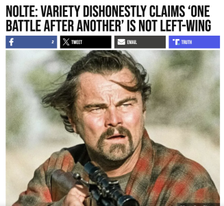 Nolte: “What [Gleiberman] doesn’t tell you is that DiCaprio’s Bob is a moron. Why? Because One Battle After Another only portrays white people as either useless idiots or evil racists. Director Anderson is so exacting with this agenda that every single member of the military (ICE) is white.