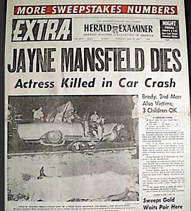 Please forgive my morbid interest in Jayne Mansfield‘s gruesome car crash death, which happened in the wee hours in rural Louisiana on 6.29.67. Mansfield, her scumbag boyfriend Sam Brody, an attorney, and the 19 year-old driver, Ronald B. Harrison, were instantly killed when their car, travelling on a two-lane blacktop between 60 mph and 80 mph, smashed into a tractor-trailer which had slowed nearly to a standstill. It was reportedly quite foggy with limited visibility, and yet Harrison drove through this atmospheric muck like a bat out of hell. He basically murdered Mansfield.