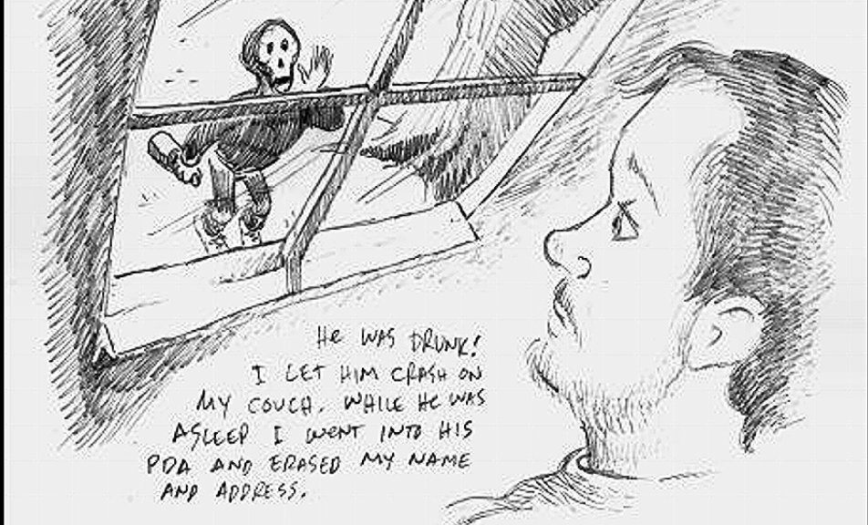 As soon as the lights came up Browne whipped out his sketch pad and, in the space of two or three minutes, drew a cartoon of Henry and his friends in their seats, their eyes wide with terror and with little piss puddles on the floor below. Browne went up to Henry in the downstairs lobby and showed him the drawing. I can recall Henry’s dryly bemused expression with absolute clarity.