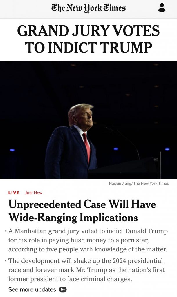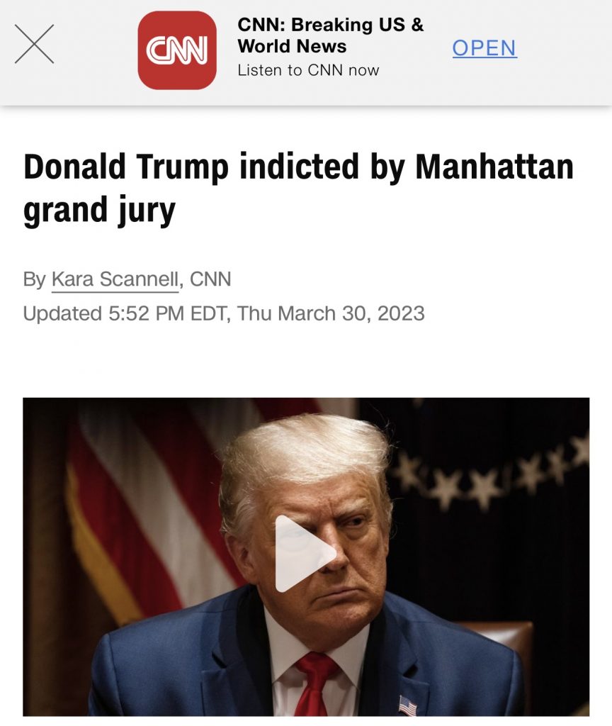 Alvin Bragg’s indictment of Donald Trump is warranted under New York State law, but it’s a nickle-and-dime beef. Ditto, if you ask me, the Mar a Lago refusing-to-relinquish-documents charge. The indictments that will really matter will be about inciting the Jan. 6th riot and trying to steal the Georgia vote in the 2020 election.