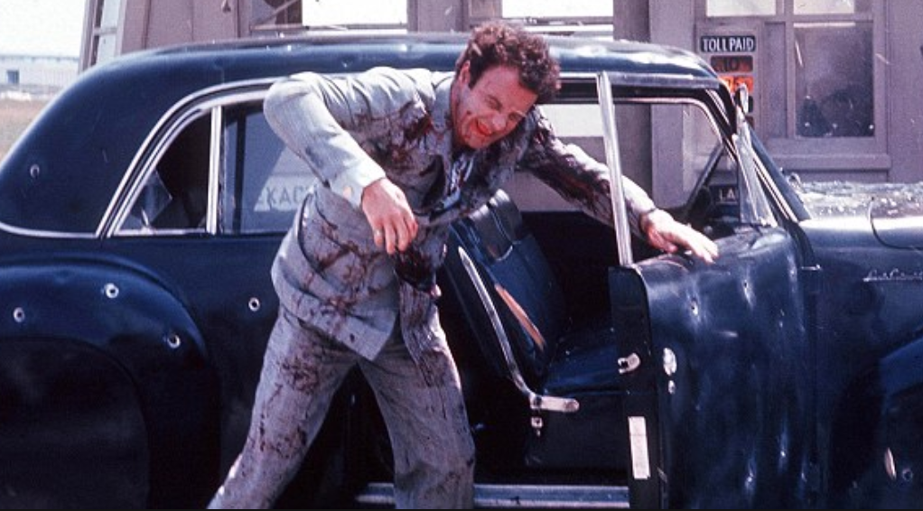 Gunshot squibs are little micro-explosive devices that leak or spray dark-red glop to indicate that a character has been shot. They’re been used by filmmakers for the last half-century or so. The first time I noticed them was during the machine-gun slaughter scene at the end of Bonnie and Clyde. Since the early ’80s I’ve been on dozens of film sets and talked to two or three guys who knew all about squibbing, but I never once heard about squibs being activated by crew guys pulling on fly-fishing lines. These were apparently used in the gangland massacre of Sonny Corleone scene in The Godfather. It seems kind of silly to yank on two or three fishing lines in order to make a bullet hole or two appear. With the sound of rattling gunfire and the screaming and abundant bleeding and the fast cutting who’s going to notice if a little black hole or two suddenly appears on James Caan‘s face? Nobody.