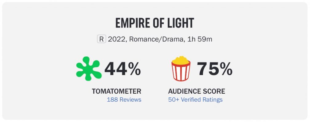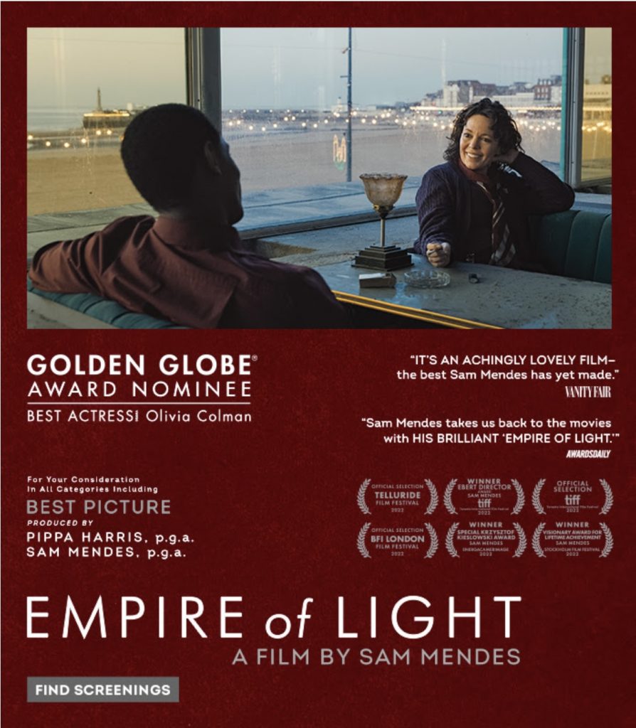 Sam Mendes’ Empire of Light, HE’s choice for the Best Film of ‘22, has earned a solid passing grade (75%) from Joe and Jane Popcorn on Rotten Tomatoes. This represents a significant 30-point difference from the views of RT critics, most of whom are operating under the yoke of wokester mind tyranny and therefore compelled to dismiss the curious but compelling romantic dalliance between Olivia Colman and Michael Ward’s characters.