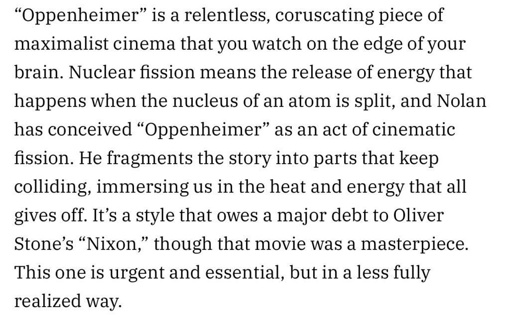 Okay, that’s it, Paul Schrader oversold it and now the game is more or less over — Chris Nolan’s Oppenheimer (Universal, 7.21) has been given a respectful-but-no-Cuban-cigar review by Variety’s Owen Gleiberman.