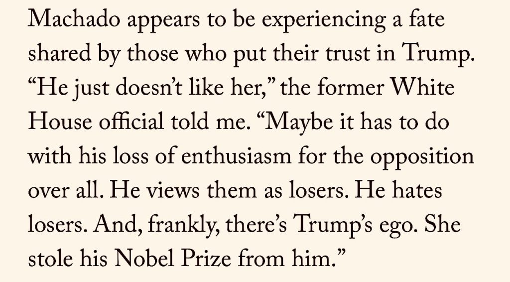Trump Mussolini likes N.Y. Mayor Zohran Mamdani (chemistry, paternal admiration for a young go-getter) but he has a gut dislike for Venezuela’s Maria Machado, the recent Nobel Peace Prize winner who won (by proxy) à landslide victory against Nicholas Maduro in 2024.