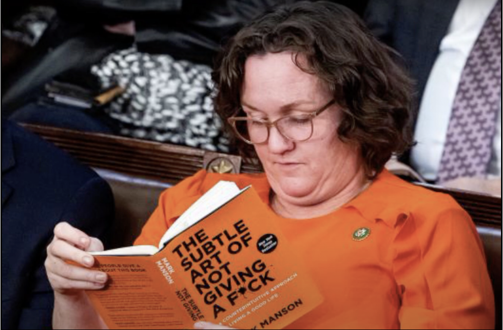 HE also supports Congressperson Porter‘s recently-announced campaign to fill Sen. Dianne Feinstein‘s U.S. Senate seat in 2024. She knew she’d get a lot of attention for (a) pretending to ignore the Kevin McCarthy House Speaker vote by reading Mark Manson‘s “The Subtle Art of Not Giving a F*ck” and (b) for wearing an orange dress that matched exactly the shade of orange on the Manson book jacket.