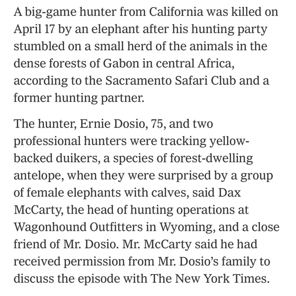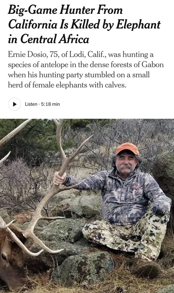 He Who Lives By The Sword… April 28, 2026April 28, 2026 by Jeffrey Wells A mustachioed big-game hunter gored to death by a female elephant? Sounds good! Deserved! N.Y. Times report , posted on 4.25.26: