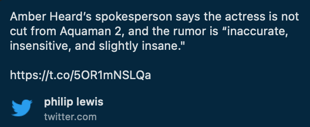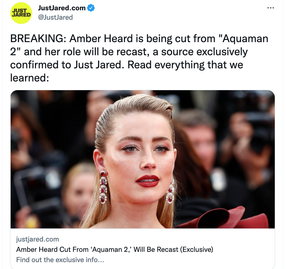 Despite dicey gossip stating that Amber Heard‘s Mera appears in several scenes in the forthcoming Aquaman and the Lost Kingdom (Warner Bros., 3.23), JustJared is reporting that she’s been cut from the film and that another actress will replace her.