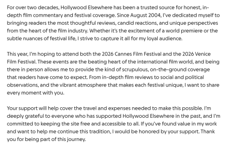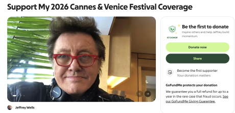As it went last year, HE’s 2026 GoFundMe is a double-header. I’m trying to raise enough scratch to attend both the 2026 Cannes Film Festival (Monday, 5.11 thru Saturday, 5.23) and 2026 Venice Film Festival (Wednesday, 9.2 to Sunday, 9.12), and now HE’s 2026 GoFundMe page is up and rolling.