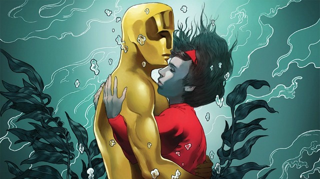 We all know that Oscar’s arms are traditionally folded as he clasps an upside-down sword, but Naki could have gone anywhere with this. She could have shown Oscar giving Hawkins a sexy bear hug or kissing her on the lips, or caressing her hair with his left hand while his right hand strokes her neck. Instead she portrayed him as respectful but passive — a good friend or a son, but not a lover.