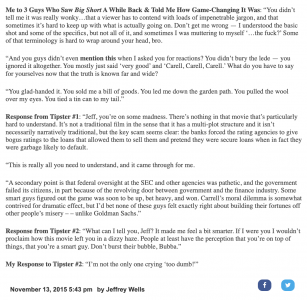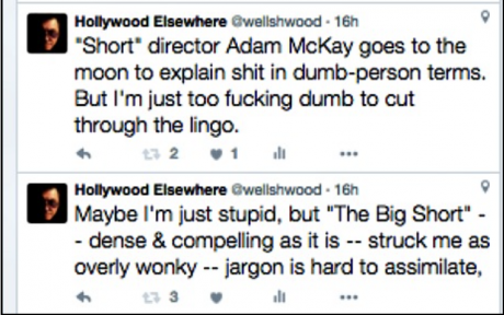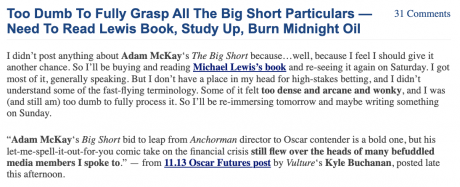I still have problems with the opening 25 or 30 minutes (Christian Bale‘s Michael Burry, a barefooted genius analyst who looks stoned half the time, still drives me crazy), but once Ryan Gosling‘s Jared Vennett steps in and becomes a regular presence, it’s all good.