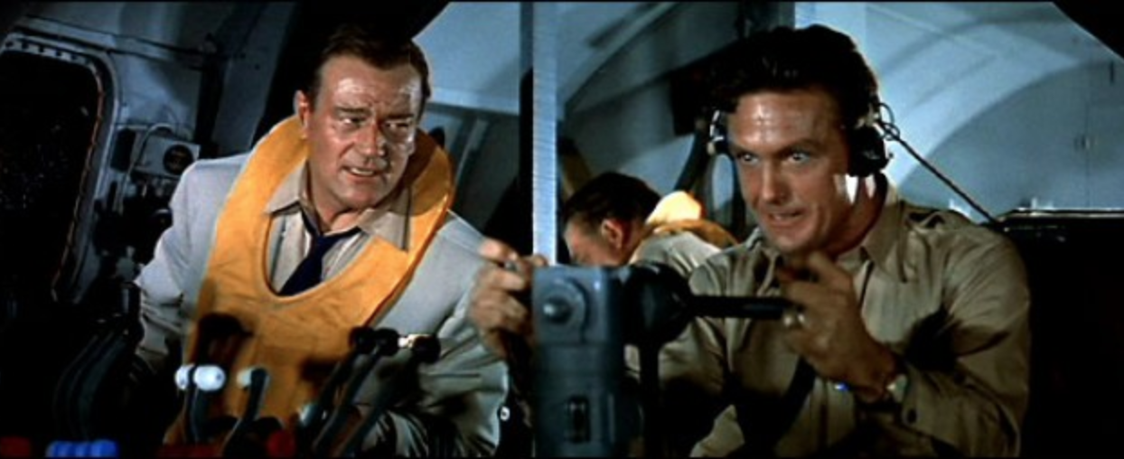 You can make fun of the San Francisco touch-down scene in William Wellman‘s The High and the Mighty (’54), and particularly Dimitri Tiomkin‘s angelic-choir music that amplifies the emotion. You can call the Christian symbolism tacky, I mean, but I went through something similar once in a private plane as we landed in St. Louis under heavy fog, and it looked and felt exactly like this. (Yeah, I wrote about this seven years ago and what of it?)