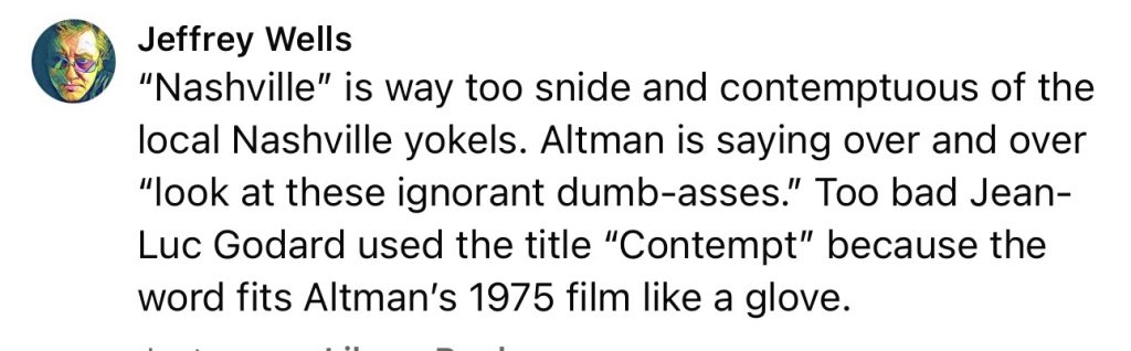 Two nights ago I watched the Criterion Bluray of Robert Altman‘s Nashville (’75). And guess what? It doesn’t hold up. It’s earnestly dislikable. I wanted to shut it off after the first half-hour.
