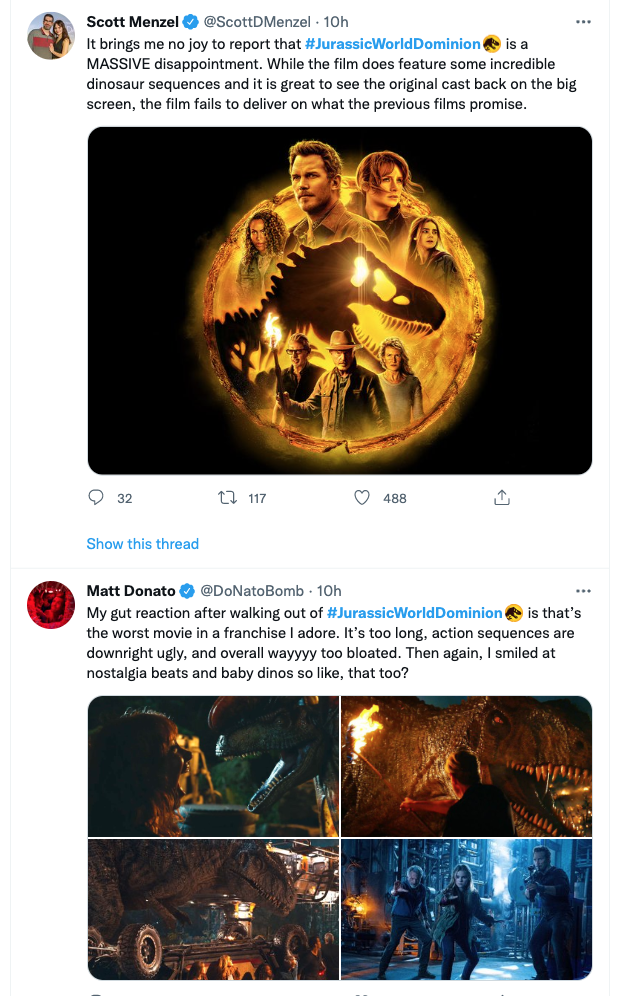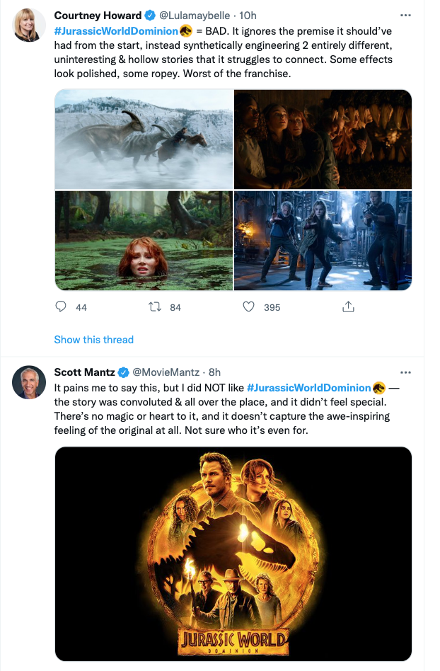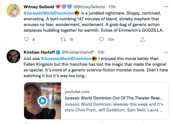 The delighted reactions of Collider‘s Perri Nemiroff and Variety‘s Jazz Tangcay aside, Jurassic World Dominion (Universal, 6.10) is allegedly dogshit. I won’t catch it until Thursday afternoon, but what am I gonna say?