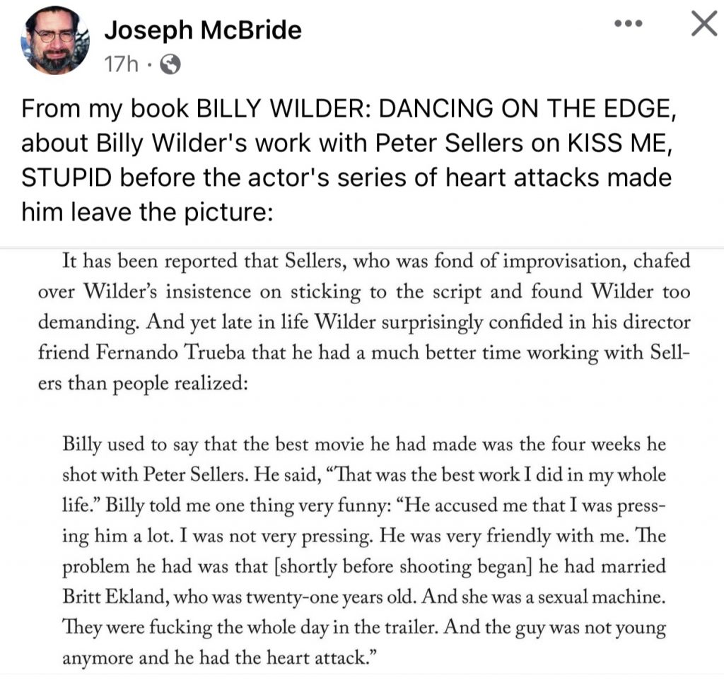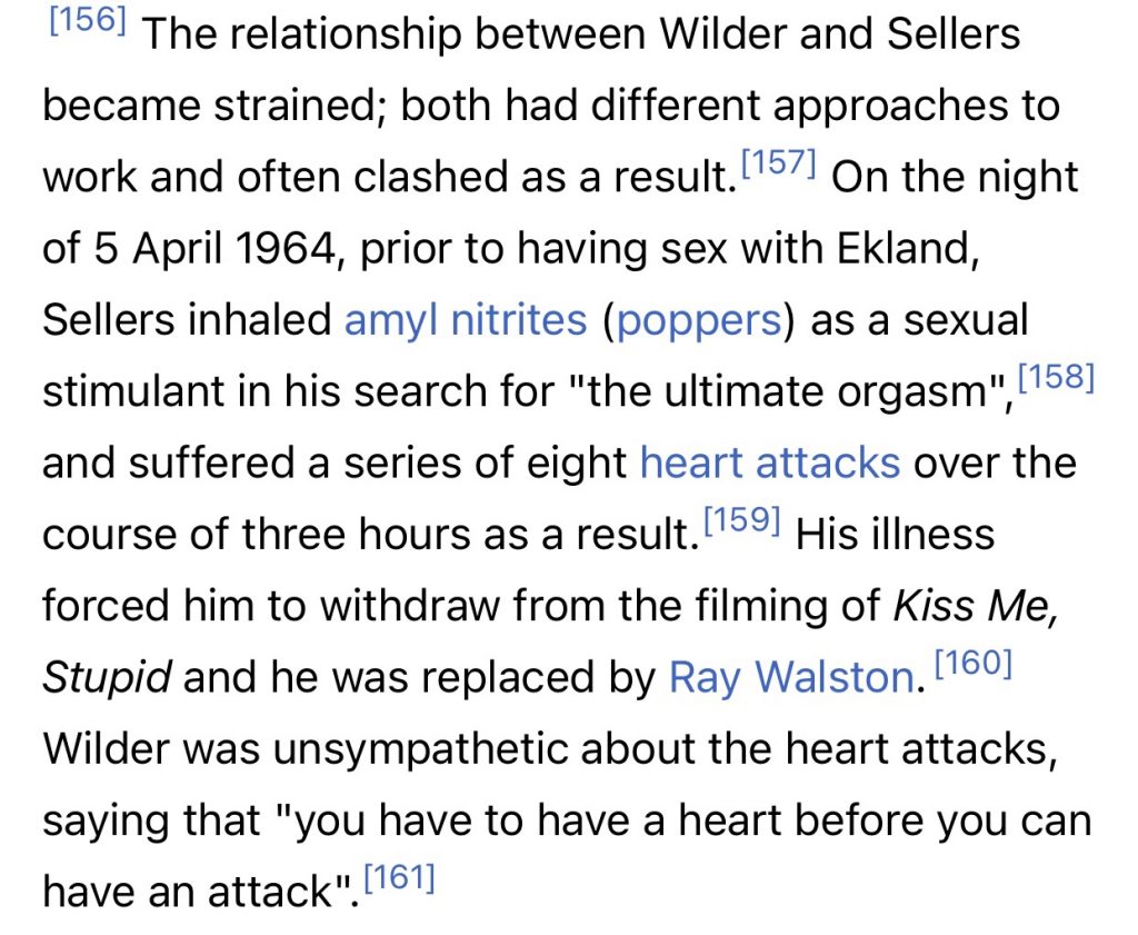 It Wasn’t Sex or Ekland — It Was The Poppers March 26, 2023March 25, 2023 by Jeffrey Wells Eight heart attacks within 180 minutes? I’ve never inhaled amyl nitrite — I’m stating that with a certain degree of pride. Wait…did I? Sellers Wiki: