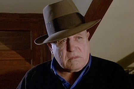Brim-wise Todd Field‘s hat is obviously similar to the one worn by John Wayne in Rio Bravo (’59). But the thick hat band is pure urban noir, like the brown tough-guy hat worn by the 68-year-old Laurence Tierney in Norman Mailer‘s Tough Guys Don’t Dance (’87).