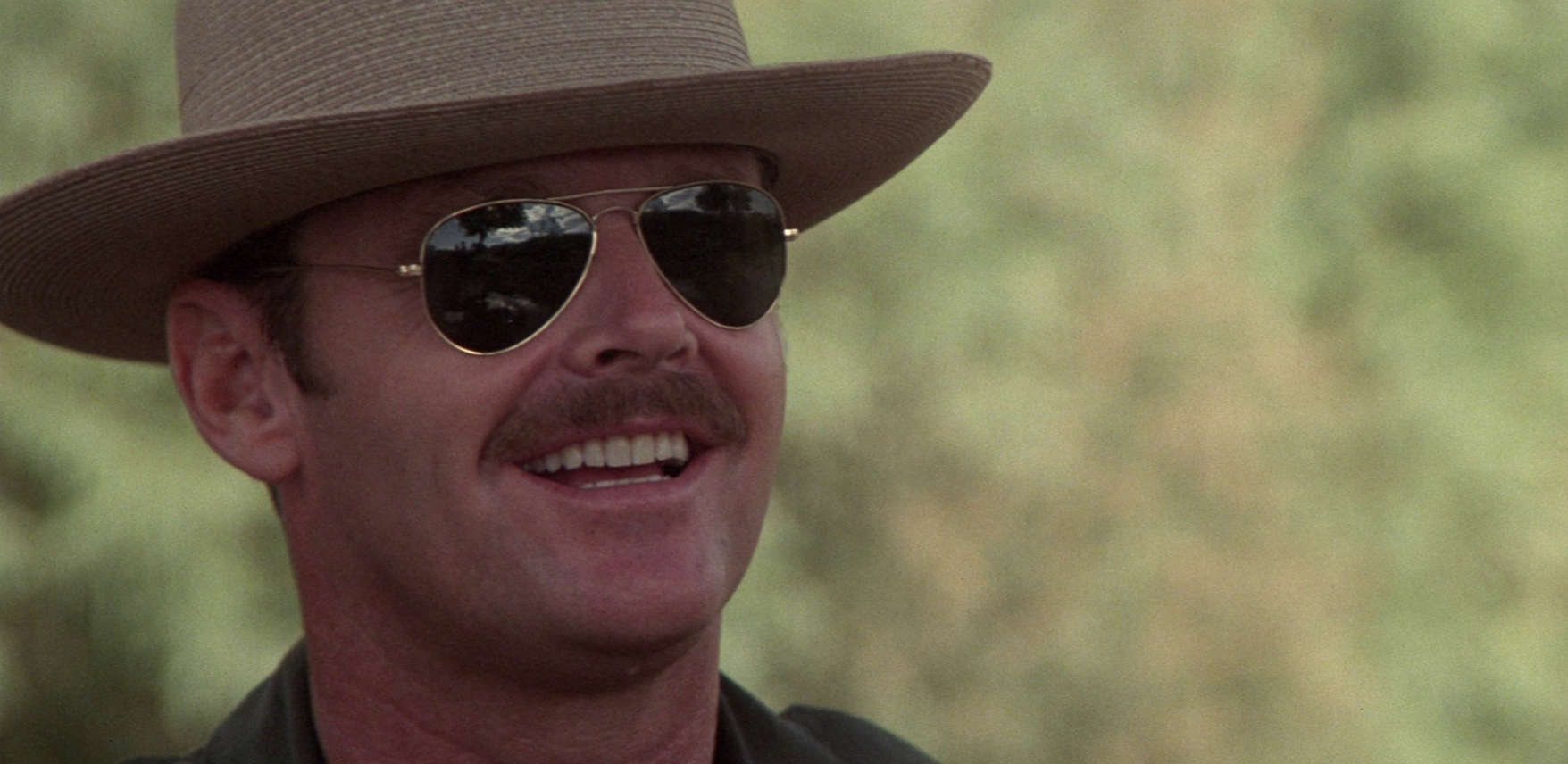“When, early in The Border, Nicholson muses about how, back in California, ‘I liked feeding those ducks,’ one’s first reaction is: ‘Feeding them what? Strychnine?’ Nicholson’s voice, with the silky menace of an FM disc jockey in the eighth circle of hell, has always suggested that nothing in the catalogue of experience is outrageous enough to change his inflection. Even when he goes shambly and manic (Goin’ South, The Shining), Nicholson’s voice and those tilde eyebrows give the impression…” and blah blah.