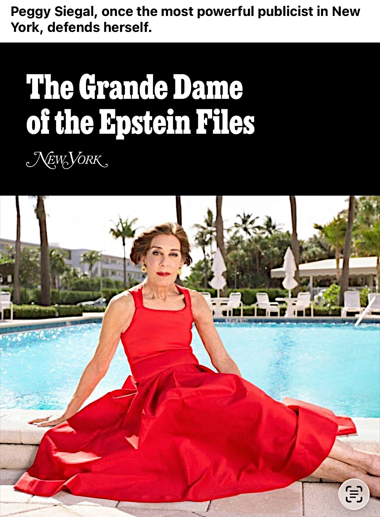 Siegal was extensively quoted in a 3.5 New York interview piece. Same old same old. She fraternized and exchanged favors with a bad guy, but had nothing to do with Epstein’s predations. Zip.